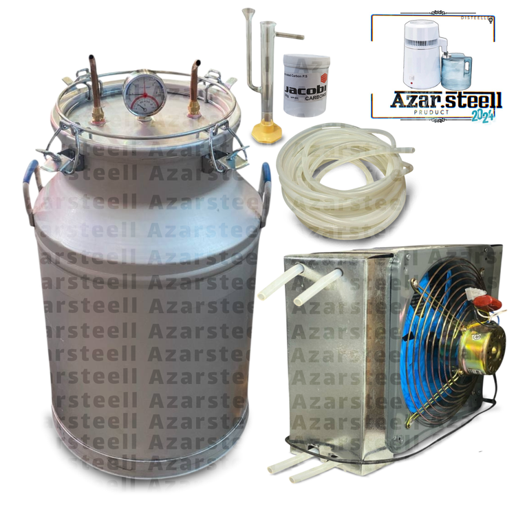 فول پک کامل ۲۰۰ لیتری با کندانسور شیشه ای پیرکس همراه با فشارسنج و حرارتسنج و ۲ ورود ۲ خروجی دستگاه حرفه ای تولید شده در مجموعه آذر استیل .